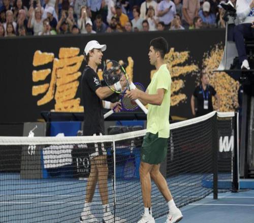 阿爾卡拉斯(右)在表演賽中戰(zhàn)勝德米納爾。