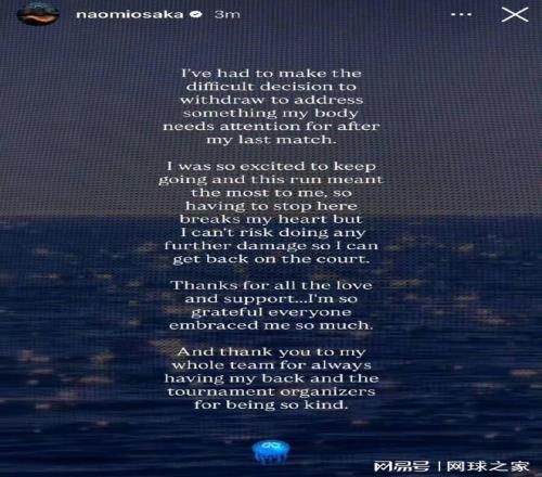 這位四屆大滿貫冠軍得主在發(fā)文中感謝了球迷、團(tuán)隊(duì)和賽事主辦方的支持,并表示期待未來重返賽場。