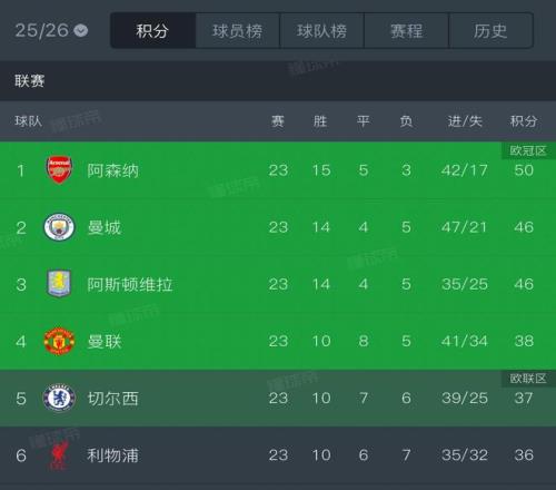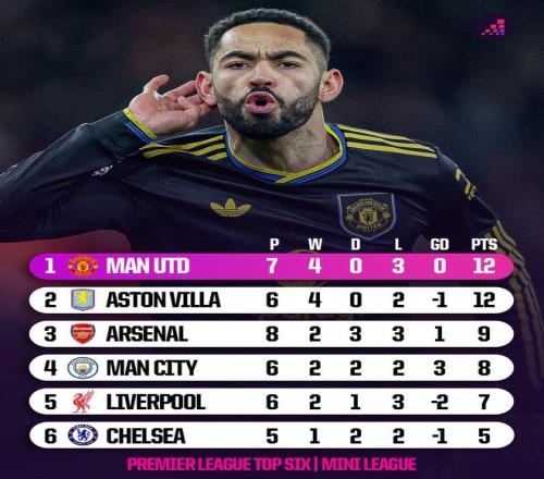 英超前六相互交鋒積分榜:曼聯(lián)、維拉積12分最多,阿森納9分