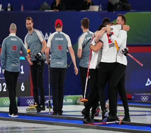 面對9–1的巨大差距,挪威隊(duì)提前握手認(rèn)負(fù)。最終,揚(yáng)尼克·施瓦勒領(lǐng)銜的瑞士奪得男子冰壺銅牌。