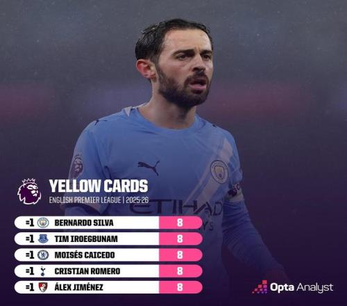 英超第27輪,曼城主場2-1擊敗紐卡斯?fàn)柭?lián),曼城隊長伯納多-席爾瓦因犯規(guī)染黃,至此,伯納多-席爾瓦本賽季英超已領(lǐng)到8張黃牌,追平個人單賽季英超最多紀(jì)錄。